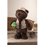 Boris the Fishing Bear by Gund. Boris is wearing a vest and fishing cap with fishing lure on the front. Fish in one hand, press his other hand and he sings "Hooked on a Feeling